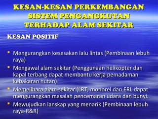 Ini dijalankan untuk mencari langkah-langkah penyelesaian untuk mengatasi masalah. KESAN PERKEMBANGAN PENGANGKUTAN TERHADAP ALAM SEKITAR PENCEMARAN UDARA. Jalan raya Lebuh raya Jalan kereta api air udara Sistem laluan ini akan menghubungkan tempat-tempat dlm.