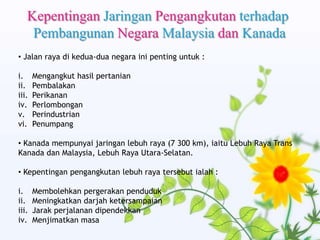 MAKSUD JARINGAN PENGANGKUTAN Sistem laluan pergerakan melalui. Pengangkutan berkait rapat dengan pergerakan barangan. Malaysia dan kanada mempunyai jaringan.